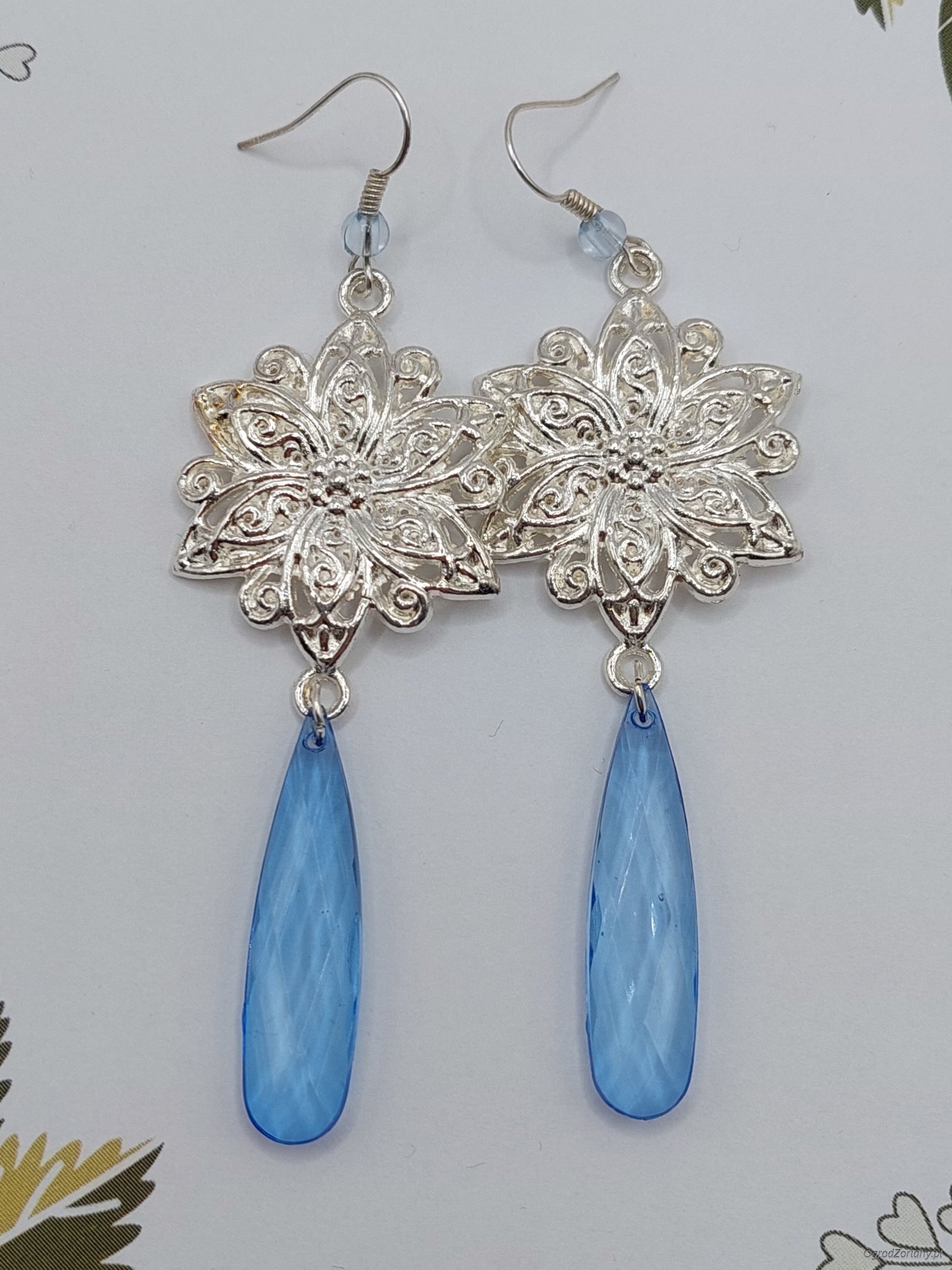 Piękne, subtelne kolczyki kojarzące się z biżuterią elfów. Kwiat - podstawa misternie wykonany z dbałością o szczegóły każdego płatka. Smukłe łzy, choć z fasetowanego akrylu, wyglądają jak prawdziwe akwamaryny lub czysty, zimny kryształ. Doskonałe na eleganckie wyjścia.