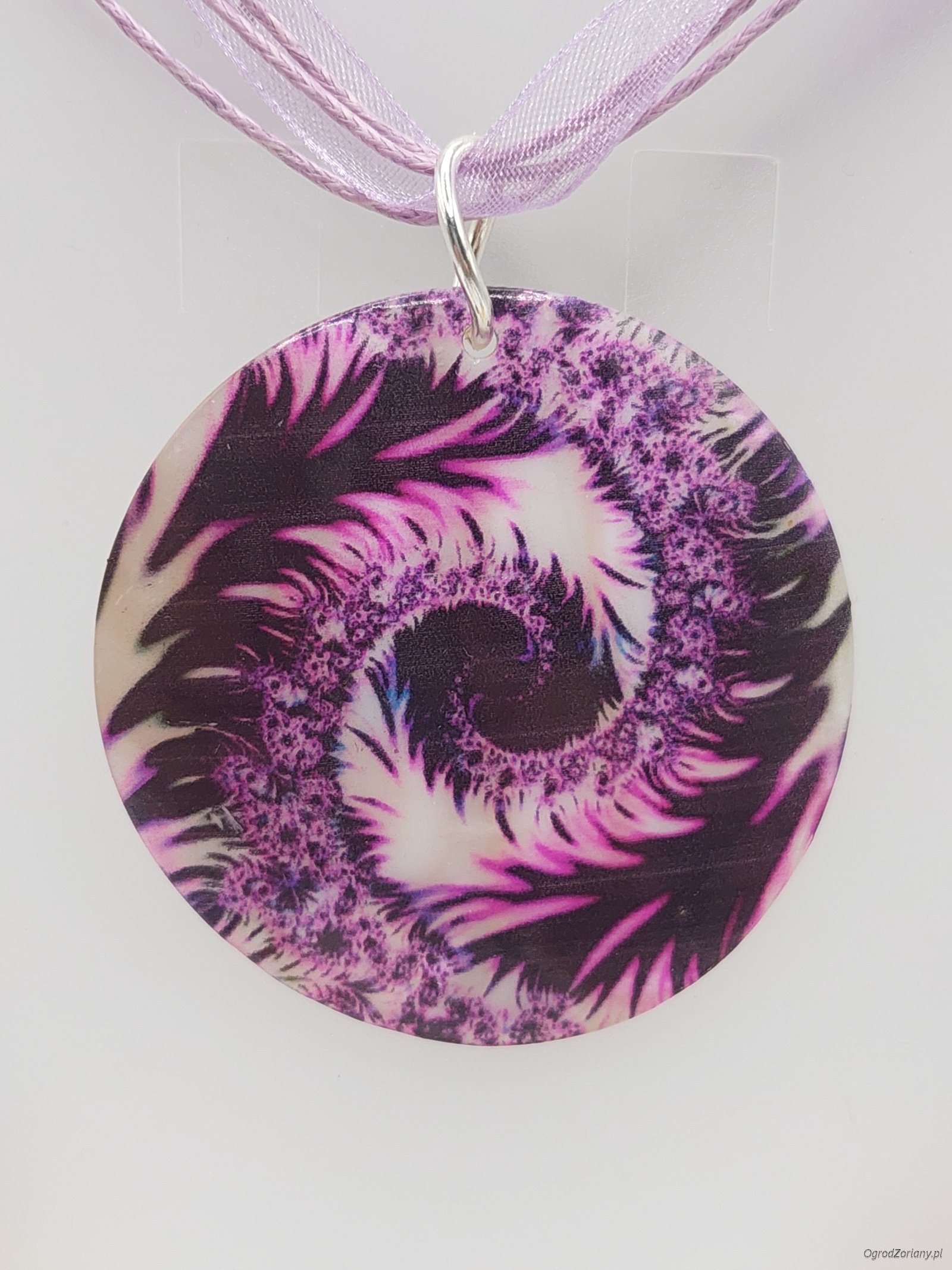 Elegancki naszyjnik w kształcie malowanego w pióra dysku naturalnej muszli zawieszonego na podstawie naszyjnika w postaci połączonych ze sobą sznurków bawełnianych i satynowej wstążki. Naszyjnik duży i efektowny - pięknie ozdobi dekolt w różnych letnich stylizacjach. Doskonały jako prezent. Elementy metalowe - antyalergiczne.