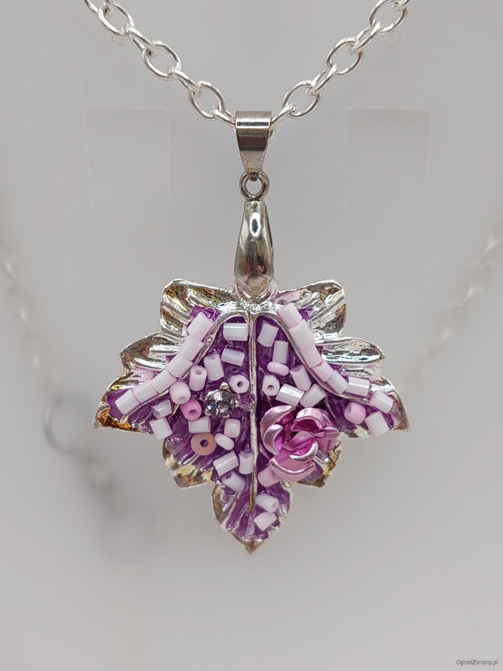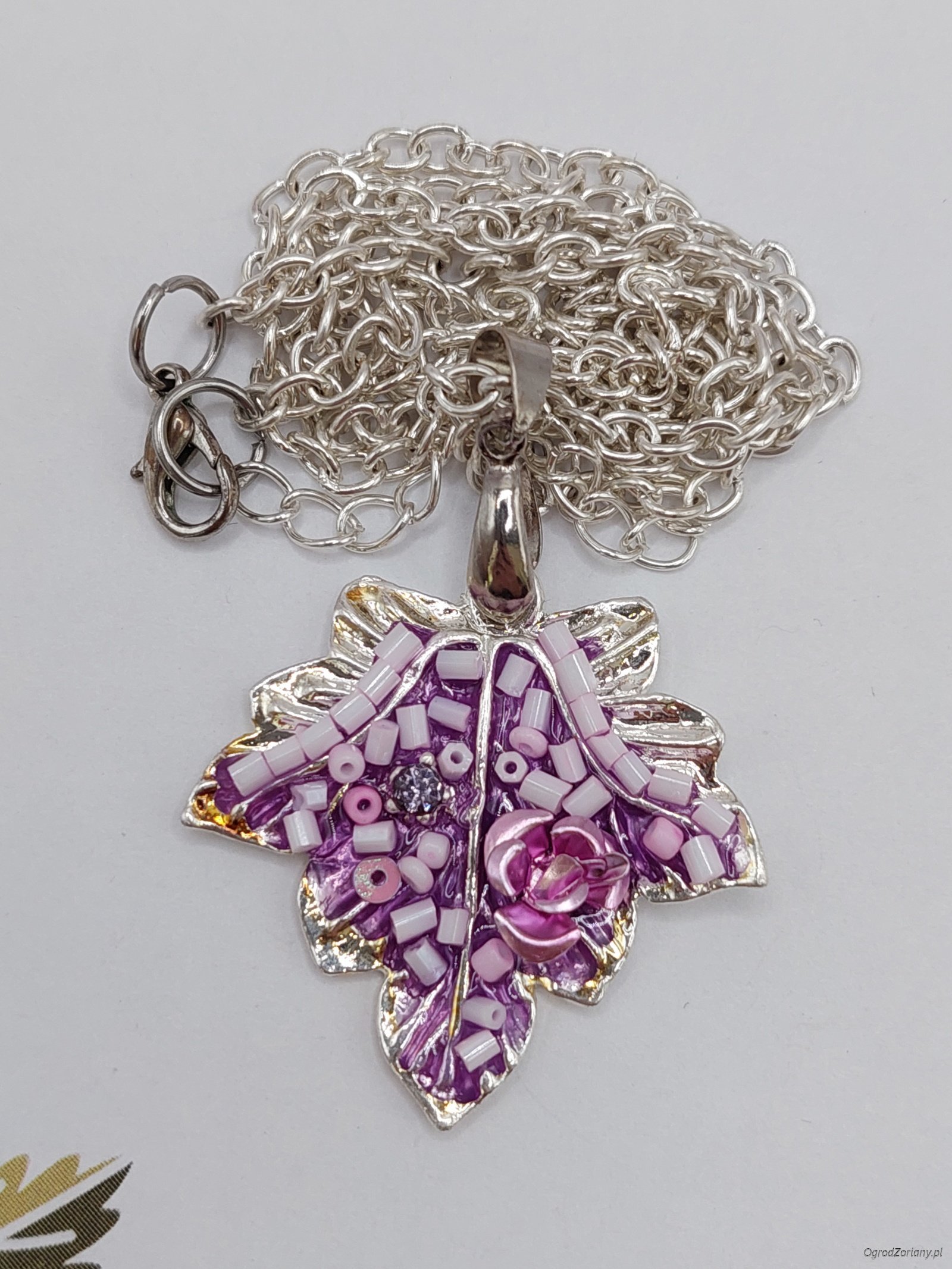 Delikatny naszyjnik w formie łańcuszka z przewieszką w kształcie wysadzanego koralikami i ozdobionego metalową różyczką liścia brzozy. Przewieszka umieszczona na ozdobnej krawatce. Naszyjnik dla pań w każdym wieku, wdzięcznie ozdobi niejedną kreację. Elementy metalowe - antyalergiczne.