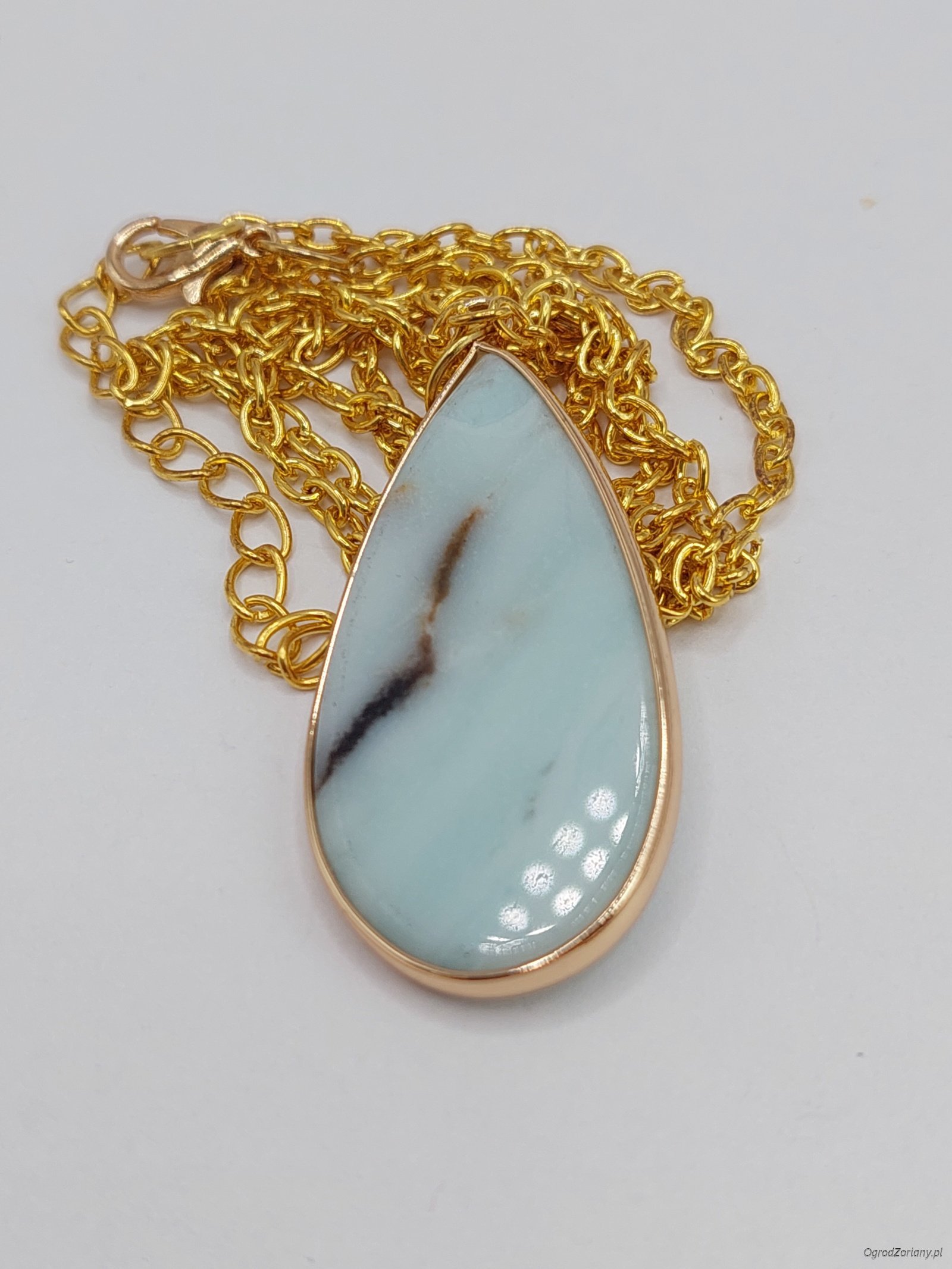 Elegancki naszyjnik w formie łańcuszka z podwieszką z naturalnego amazonitu. Amazonit ma kształt gładkiej kropli i na brzegach jest okuty złotym metalem, dzięki czemu jest dwustronny. Dzięki jedynej w swoim rodzaju niebiesko-zielonej barwie kamienia, naszyjnik jest piękny, delikatny i będzie pasował do każdej kreacji. Doskonały jako prezent. Elementy metalowe - antyalergiczne.