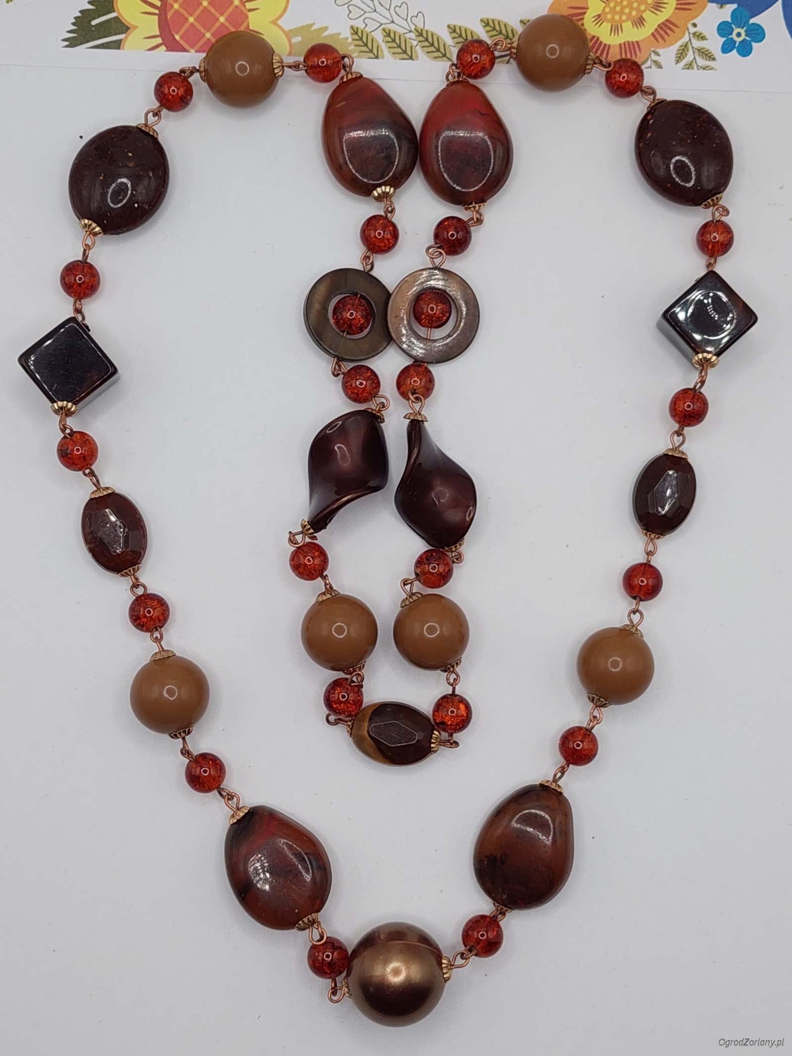 Długi naszyjnik w ciepłych odcieniach brązu. Wykonany z ringów z masy perłowej oraz z akrylowych bryłek, kul, sześcianów, oliwek i świderków połączonych ze sobą kulkami szklanymi cracle. Wszystkie koraliki ozdobione złotymi czapeczkami z kształcie kwiatków. Naszyjnik doskonały jako ozdoba jednolitych swetrów, tunik i ciepłych sukienek. Elementy metalowe - antyalergiczne.