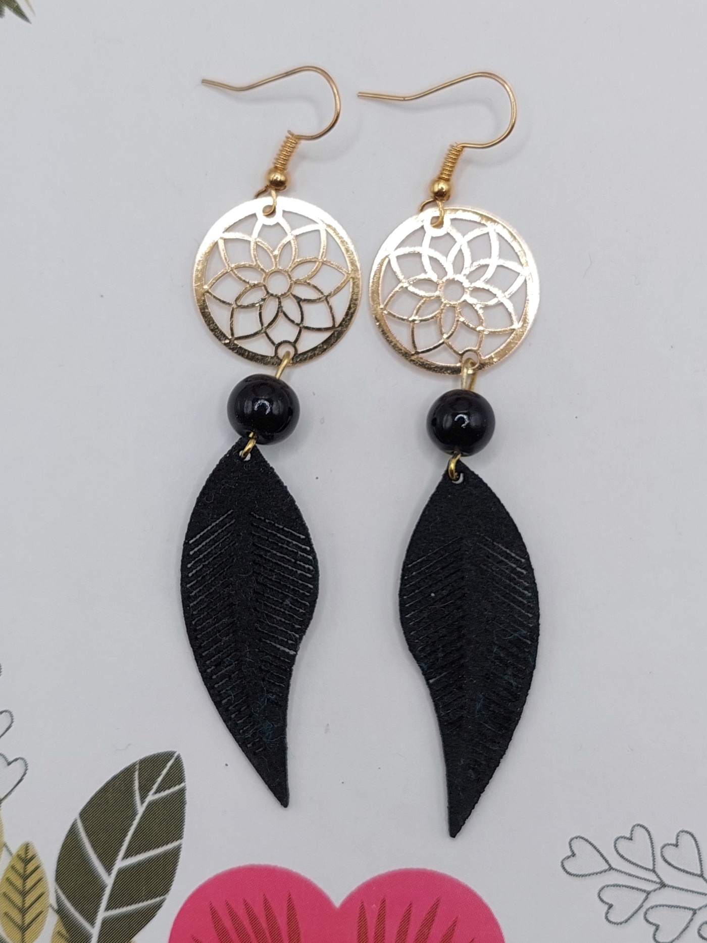 Kolczyki mandale z zamszowymi piórkami i onyksem