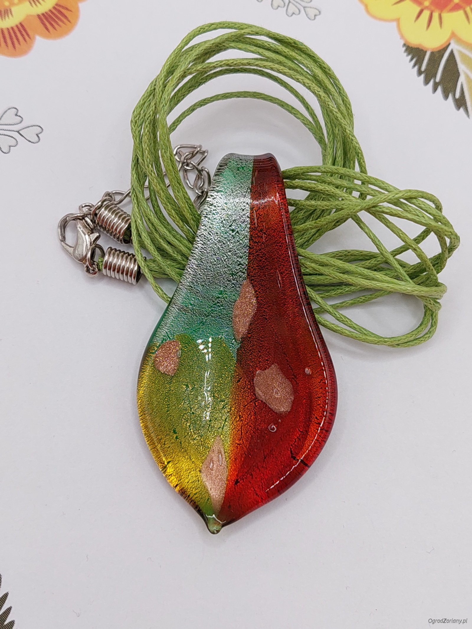 Efektowny naszyjnik w kształcie wielobarwnej łzy ze szkła weneckiego zawieszonej na podstawie naszyjnika w postaci połączonych ze sobą sznurków bawełnianych. Naszyjnik na tyle duży i reprezentacyjny, by pięknie ozdobić dekolt w letnich stylizacjach. Doskonały jako prezent. Elementy metalowe - antyalergiczne.