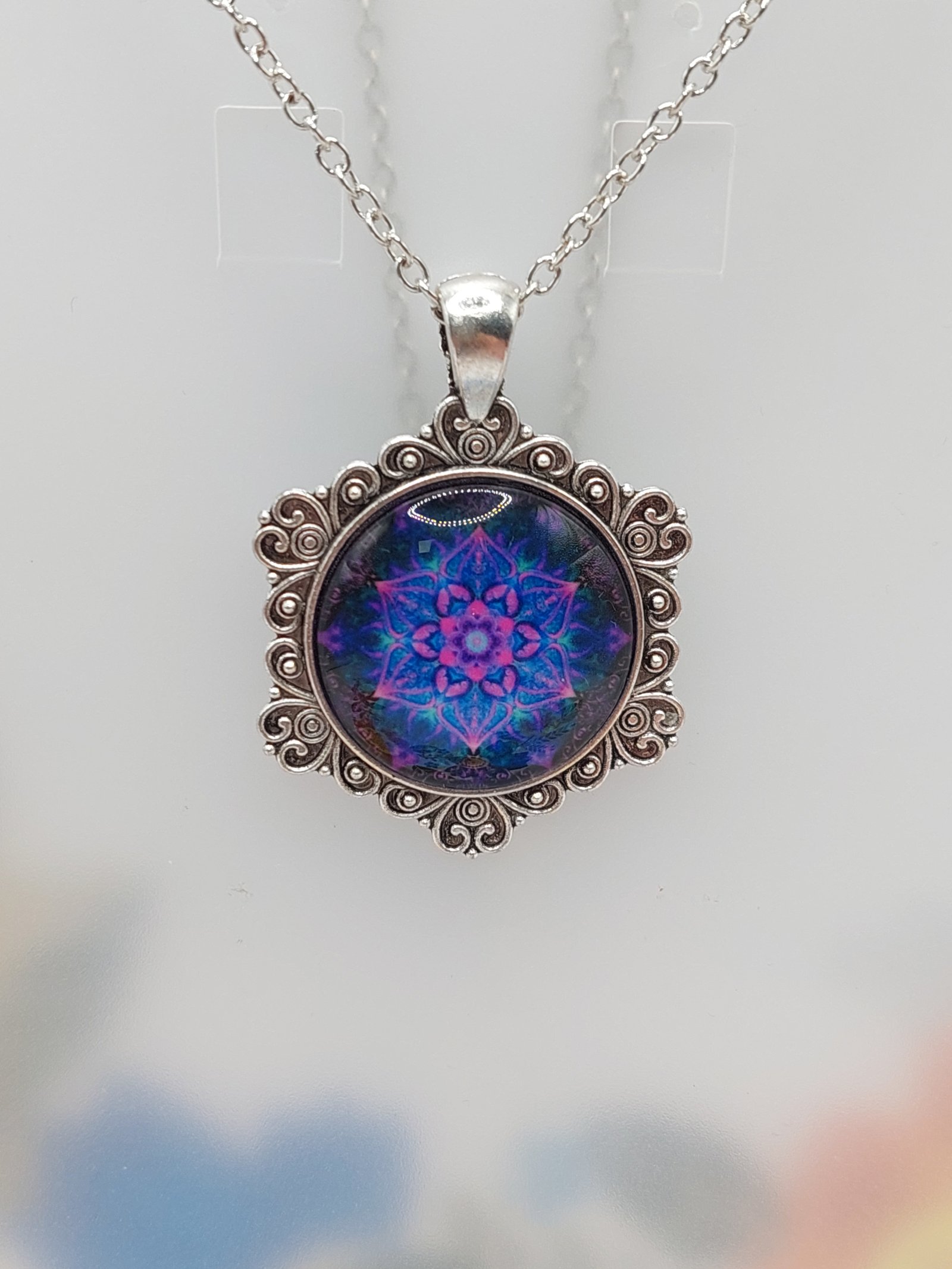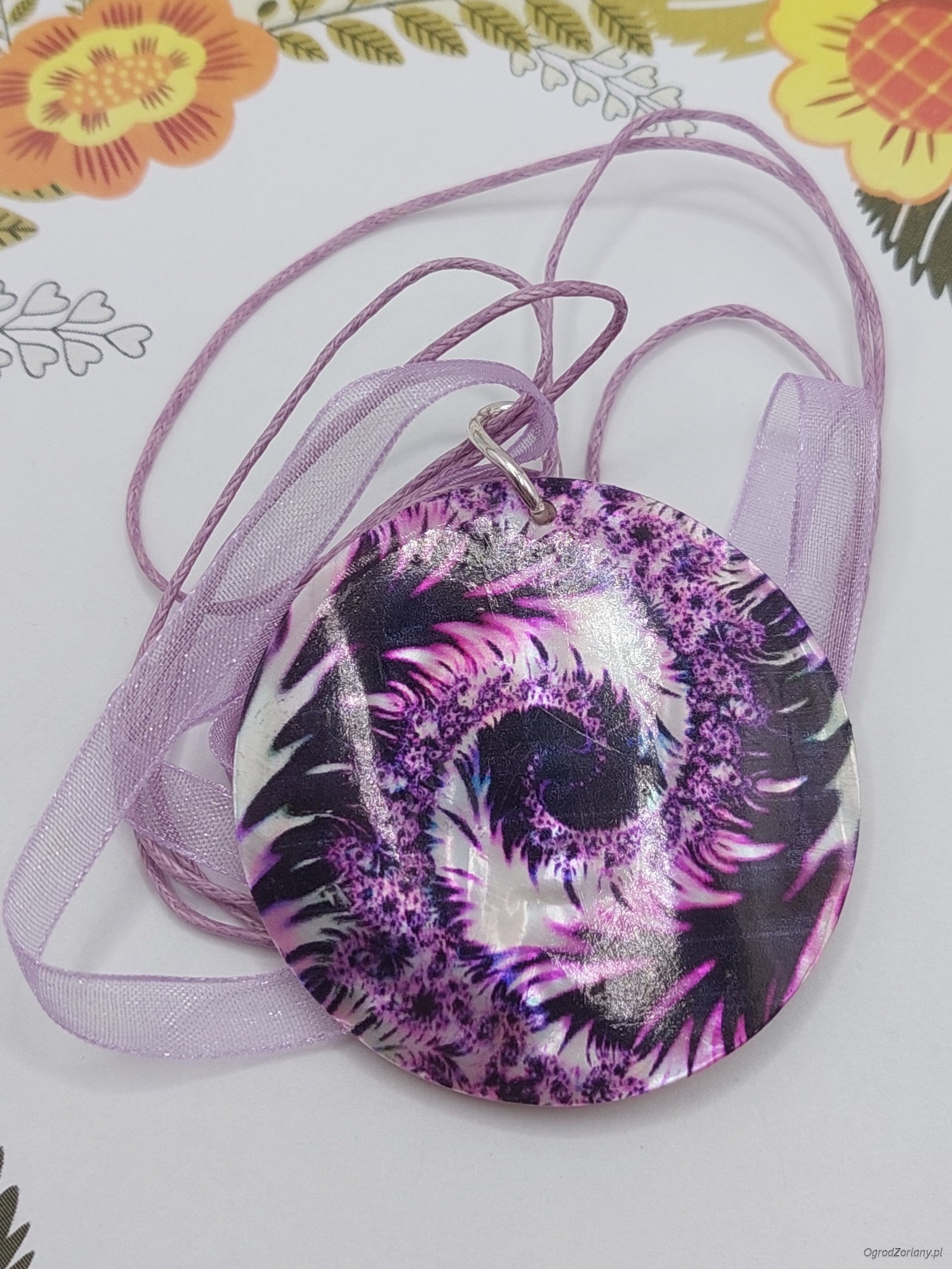 Elegancki naszyjnik w kształcie malowanego w pióra dysku naturalnej muszli zawieszonego na podstawie naszyjnika w postaci połączonych ze sobą sznurków bawełnianych i satynowej wstążki. Naszyjnik duży i efektowny - pięknie ozdobi dekolt w różnych letnich stylizacjach. Doskonały jako prezent. Elementy metalowe - antyalergiczne.